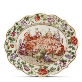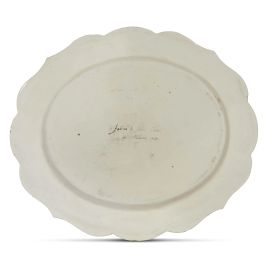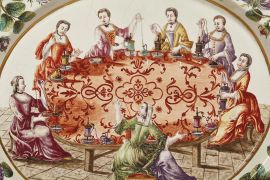 Questa è l’opera più solenne della produzione della manifattura di Felice Clerici del Settecento a Milano. Lo dichiara la dimensione, la forma modellata a stampo derivata dall’argenteria, in “maiolica fina” con lo smalto ricco e pannoso, coi profili dorati e la decorazione pittorica con grandi rose sulla tesa e sette dame sedute al tavolo di lavoro, dipinta con colori preziosi, le porpore, nei toni di rosa e viola, derivati dal cloruro d’oro. Sul retro solennemente è marcata in corsivo “fabrica di Felice Clerici in Milano.” Le sette donne protagoniste lavorano con fusi moderni alla filatura della lana perché nello stabilimento dell’Ospedaletto di Sant’Ambrogio i Clerici producevano in un grande lanificio, accanto alla manifattura ceramica, diversi “nuovi” tessuti per la città: “camellotti”, velluti e flanelle. La formula spaziale è curiosa: il piano del tavolo, ellittico potenziato dal colore rosso, riprende la forma del piatto, mentre il piano pavimentale dipinto con un colore neutro leggero, con l’ombra portata delle gambe del tavolo e delle sedie, dando un leggero effetto di profondità. Le lavoratrici, protagoniste della scena, sono dame: hanno abiti dal ricco panneggio, ostentano eleganza e ricchezza in pizzi, cuffie e gioielli; i loro visi sono di raffinata esecuzione. E i loro strumenti “moderni” per la filatura tessile sono in bella mostra. Sulla tesa, è fortemente potenziato il gioco naturalistico del ramo spinoso, sinuoso, con belle rose, foglie e boccioli in una formula pittorica veramente straordinaria rispetto alla consuetudine milanese. I fiori, che derivano dal “Livre de Toutes Sortes de Fleures d’aprés Nature” disegnata da Jean Baptiste Monnoyer e inciso da Jean Vauquer verso il 1680, che aveva una larghissima diffusione tra gli ornamentisti europei, sono stati molto probabilmente dipinti da un decoratore ospite: lo stile è affine a quello degli “Hausmaler” tedeschi itineranti. Molto probabilmente questo grande piatto è stato realizzato pochi giorni prima del 26 Giugno 1769, quando Giuseppe II, figlio dell’imperatrice Maria Teresa d’Austria, in visita a Milano, passò a visitare l’importate manifattura moderna della città. Ma non gli era stato consegnato come dono, a causa del difetto della bollitura del bruno che aveva tolto perfezione alla pellicola pittorica smaltata, come vediamo anche oggi. Infatti nell’inventario della manifattura dell’Ospedaletto compilato nel gennaio 1789 è citato questo magnifico “Ovato realone con lavorerio a Molino con donne”.