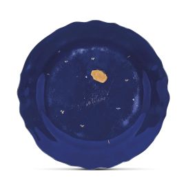 Il piattino ha forma circolare e orlo sagomato a sei punte, ed è privo di appoggio. Il decoro è quello tradizionalmente definito “a paesini a smalto a comparto blu”. Al centro una riserva polilobata orlata di rosso, occupata da due isole abitate rispettivamente da un’anziana donna in abiti invernali e da un cagnolino in corsa, mentre nel cielo volano un uccellino variopinto e degli insetti. La tesa e il retro sono interamente ricoperti di smalto color cobalto.