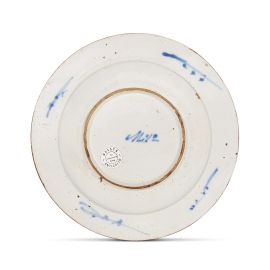 in maiolica dipinta in policromia. Al verso scritta Mil.o in blu di cobalto ed etichetta di provenienza Questa Antichità Torino; diam. cm 22,2, alt. cm 3,2