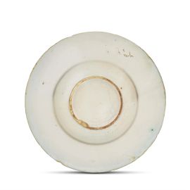 in maiolica dipinta in bianco sovra-smalto e policromia verde, blu arancio giallo antimonio e bruno di manganese; diam. cm 19, diam. piede cm 7, alt. cm 2,6