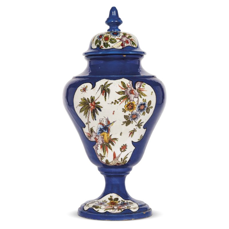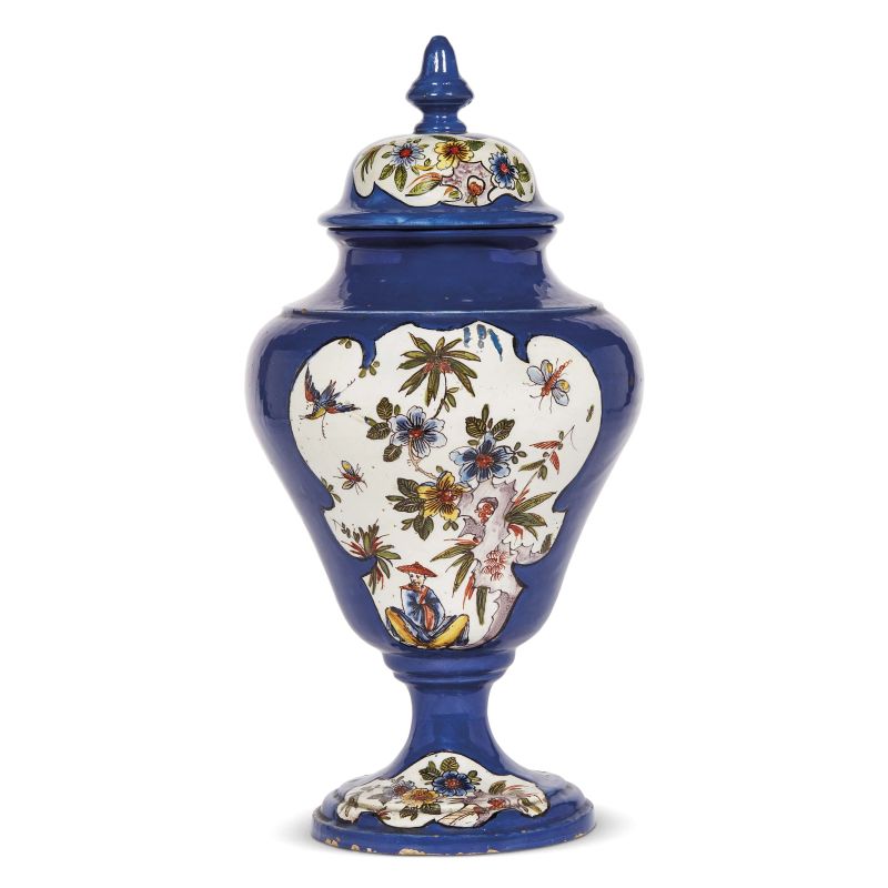 in maiolica dipinta in policromia. Sul fondo marca Mil.no appena leggibile ed etichetta della mostra Figure e Chinesi della Galleria Caviglia di Milano con il n. 8; alt. cm 28,6, diam. piede cm 13,2; coperchio non pertinente alt. cm 8