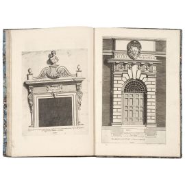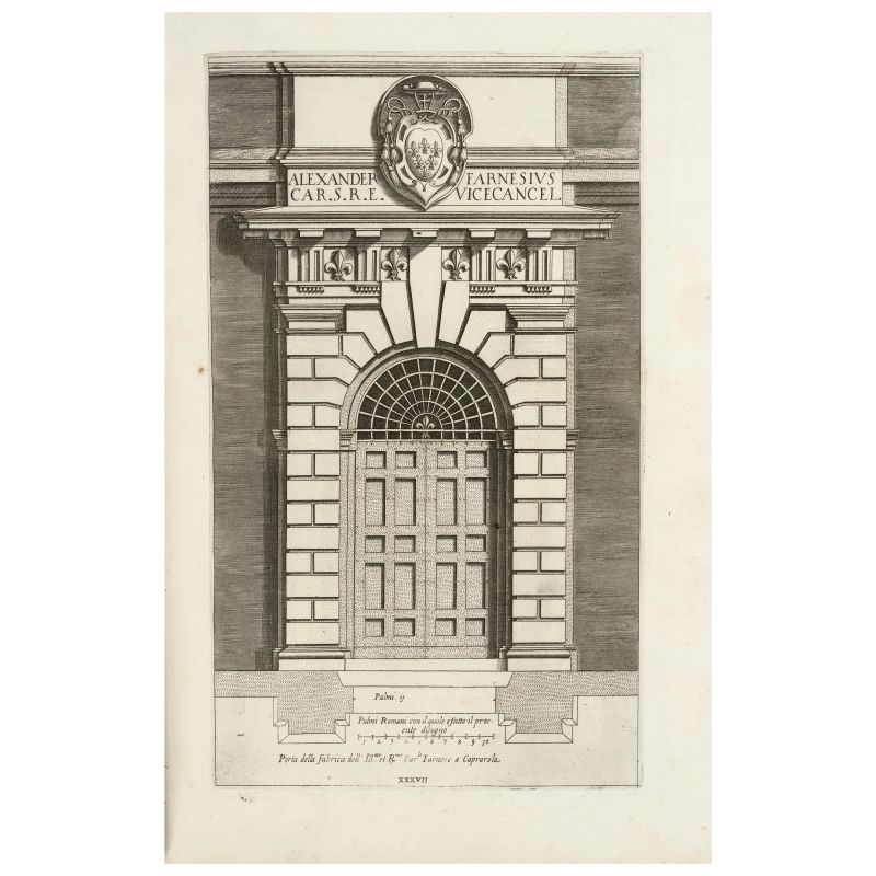 Edizione senese del celebre trattato del Vignola, che trae ispirazione dai trattati classici (Vitruvio) e rinascimentali (Alberti) e che, per l’efficacia didattica della chiarezza espositiva, divenne un pratico prontuario ed ebbe larghissima diffusione fino alla fine del’800. Le tav. XXXIII-XXXVII illustrano vari portali ed un caminetto, mentre con la tavola [XXXVIII] inizia la “Nuova et ultima aggiunta delle porte d’architettura di Michel Angelo Buonaroti”, col ritratto del medesimo Michelangelo all’età di 73 anni.