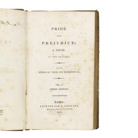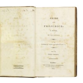 TERZA EDIZIONE DI QUESTO CLASSICO DELLA LETTERATURA MONDIALE. Copia in legatura coeva di sapore neoclassico, completa degli occhielli spesso assenti. Orgoglio e pregiudizio, pubblicato per la prima volta nel 1813 in tre volumi, appare qui nella sua terza edizione, che è la prima in due volumi e l’ultima a essere pubblicata dall’editore originale del libro, nell’anno in cui Jane Austen morì. La bibliografia relativa (Davide Gilson, A Bibliography of Janes Austen, A5) spiega che non si conoscono i dettagli della storia editoriale di questa terza edizione, per la quale Jane Austen, avendo venduto i diritti d’autore, non fu consultata, e di cui non è presente nessuna allusione nelle sue lettere; non è chiaro se essa sia stata pubblicata dopo la sua morte, avvenuta il 18 luglio 1817. Si vendeva al prezzo di 12 scellini, il presente esemplare presso il libraio londinese William Fearman, al 170 di New Bond Street.