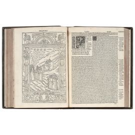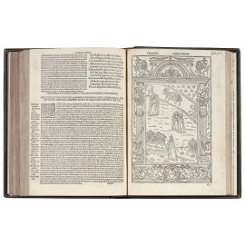 PRIMA COMMEDIA A STAMPA CON CORREDO FIGURATIVO COMPLETO PER TUTTE LE TRE CANTICHE. La precedente edizione a stampa, pubblicata a Brescia, da Bonino de’ Bonini, nel 1487, conteneva infatti una sola immagine per il Paradiso. La presente edizione è invece illustrata da tre xilografie a piena pagina in ricche cornici architettoniche all’inizio di ogni cantica, e da 97 vignette quadrate, anch’esse incise in legno. Sono immagini a puro contorno pregevoli per la loro varietà, immediatezza e precisa visualizzazione dei versi di Dante.