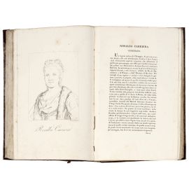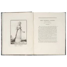 GAMBA, Bartolomeo e altri. Galleria dei letterati ed artisti illustri delle provincie veneziane nel secolo decimottavo. Vol. 1. [-2.]. Venezia, tipografia di Alvisopoli per cura di Bartolommeo Gamba, 1824. 2 volumi in 4to in mezza pelle coeva, con 69 ritratti nel primo volume, 82 nel secondo. Occasionali fioriture e aloni marginali. [CON:] Il solo volume primo (di tre) della Serie di vite e ritratti de famosi personaggi degli ultimi tempi pubblicata a Milano, presso Batelli e Fanfani, dal 1815 al 1818, contenente 101 bellissimi ritratti incisi su rame di “celebrities” dell’epoca, inclusi Nelson, Giuseppina Buonaparte, Luigi XVI, Maria Antonietta, Cesare Beccaria, Alfieri, Washigton, Linneo, Kant, Buffon, Carlotta Corday. Mozart, Winckelmann, Voltaire, James Cook. Acefalo e non collazionato, in mezza tela posteriore, tagli spruzzati d’azzurro.