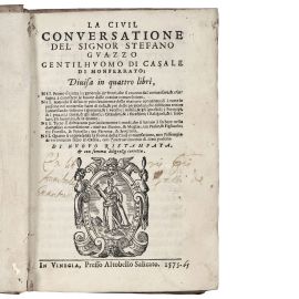 GUAZZO, Stefano. La civil conversatione del signor Stefano Guazzo, gentilhuomo di Casale Monferrato. In Vinegia, Altobello Salicato, 1575. In 8vo piccolo in pergamena flessibile coeva con lacci e titolo anticamente manoscritto al taglio inferiore. [CON:] La civil conversatione. In Vinegia, Altobello Salicato, 1584. In 8vo piccolo in cartonato posteriore con tassello cartaceo al dorso. [CON:] La civil conversatione. In Vinegia, Altobello Salicato, 1586. In 8vo piccolo in pergamena flessibile coeva con titolo anticamente manoscritto al dorso.