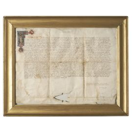 Manoscritto in latino su un unico foglio di pergamena, ca. 460 x 620 mm, 30 righe scritte con inchiostro bruno in bella minuscola umanistica verticale, spazio rigato ca. 250 x 530 mm, la prima riga con grande iniziale “F” miniata in azzurro e oro entro intreccio di tralci azzurri e verdi, e con due tondi in campo rosso, uno con quadrupede e cartiglio, l’altro con scudo con leone rampante. Sotto vetro, in cornice. -- Lacune al margine inferiore.