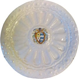 Series of 3 large pump plates in 19th century style. XVII in compendiaria majolica modeled with stylized petal motifs on the bottom and painted in polychrome in the center with small rosettes, two with coats of arms and one with a winged cherub, Ø 43.5 cm and a similar pump plate centered by a coat of arms, Ø 40 cm, 5
