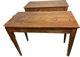 Pair of side tables, one with one drawer, rectangular tops, inlaid with geometric squares and central plant motif, quiver legs, Emilia, late 18th century, 74.5x92x45.5 cm, damage and restoration