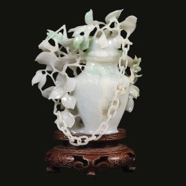 清 十九世纪 翡翠镂雕虫鸟枝叶纹盖瓶 净高11厘米