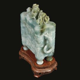 in giadeite a forma arcaica tulu con pareti rettangolari lavorate con draghi stilizzati, coperchio con drago a rilievo.