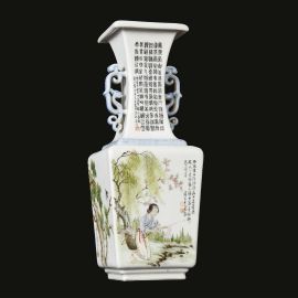 中国 二十世纪 珠山八友王大凡款《王章拜石•西施浣纱》双螭耳倭角束颈卷口四方镶器瓶 净高33厘米