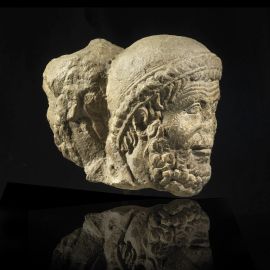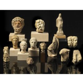 Collezione composta da ventidue reperti così descritti: testa femminile con corona turrita (h. 18 cm; largh. 15 cm, marmo, I metà II secolo d.C.), dal viso con ovale pieno e grandi occhi a mandorla dalle palpebre ben rilevate, naso dritto e fronte bassa, labbra piccole e carnose. I capelli sono raccolti in uno chignon (coperto da un velo) e divisi al centro della fronte da due bande ondulate. Ascrivibile ad una statua di piccolo formato raffigurante la personificazione di una città. Confronto puntuale con la Tyche di Antiochia; testa maschile giovanile con cercine decorato da rosetta (h. 24 cm; largh. 20 cm, marmo, II secolo d.C.), dal volto imberbe e dalla forma leggermente arrotondata, è incorniciato da capelli ondulati che si dividono in due bande sulla fronte, con ciocche arricciate ai lati del volto. Gli occhi hanno palpebre ben evidenziate. Di ispirazione classica, potrebbe rappresentare il dio Hermes; testa di Pan (h. 9 cm; largh. 6,5 cm, marmo, I - II secolo d.C.), caratterizzato da piccole corna e orecchie appuntite, presenta lineamenti molto marcati. Gli occhi sono sporgenti, hanno forma globulare e sono evidenziati da spesse palpebre. Il naso è camuso e gli zigomi pronunciati. La bocca aperta lascia intravedere la lingua ed è incorniciata da baffi fusi con la barba. Capigliatrura corta e spettinata; voluta di capitello ionico con testa di Medusa (h. 11 cm; largh. 13 cm, marmo, seconda metà II - inizi III secolo d.C.) dalla sagoma tondeggiante con serpenti annodati sotto il mento. Il volto di Medusa ha forme molli, pesanti ed espressione patetica, incorniciato da una folta capigliatura serpentiforme. Occhi incassati con pupille e iride incise. Sulla sommità della testa due ali spiegate; erma di Eracle giovanile (?) (h. 19 cm; largh. 12 cm, marmo, I secolo d.C.), rettangolare, con soggetto imberbe, coronato e cinto da una benda. Il volto è incorniciato da ciocche di capelli corti. Fronte bassa solcata da una profonda ruga, occhi piccoli ed infossati. Le labbra sono appena dischiuse. Sulle spalle è annodata la leonté, riprende un modello statuario del terzo quarto del IV secolo a.C.; doppia erma con i ritratti di due personaggi maschili barbati (h. 29 cm; largh. 35 cm, calcare, fine II secolo - inizi III secolo d.C.), pertinente ad un pilastro o ad una balaustra. Entrambi i volti appartengono a due soggetti maschili di età matura, con capelli lunghi, cercine e folta barba. Le fronti sono intervallate da forti rughe. Gli occhi sono grandi ed espressivi. Entrambi i personaggi potrebbero essere dei barbari; testa raffigurante Odisseo (h. 23 cm; largh. 18,5 cm, marmo, età imperiale), indossante il pileo e caratterizzata da baffi, barba e capelli trattati a ciocche fiammeggianti e scomposte. L'espressione è resa intensa dall'approfondimento delle orbite, i muscoli del viso sono irrigiditi, il naso è largo e la bocca è semiaperta. Copia romana tratta da un originale bronzeo ellenistico del 170-160 a.C.; testa di Demetra velata (h. 24 cm; largh. 21 cm, marmo, I - II secolo d.C.), con corona di spighe e capsule di papavero in testa. I capelli della dea sono ondulati e divisi da una scriminatura centrale, scendendo ai lati del volto formando due lunghi boccoli. Occhi e bocca piccoli; testa di figura maschile giovanile (h. 7,5 cm; largh. 4,8 cm, terracotta, I - II secolo d.C.), probabilmente Eracle giovanile con capelli resi a piccole ciocche mosse. Gli occhi sono grandi e infossati, il naso pronunciato e la bocca è piccola e chiusa. La testa, in forte torsione, è completa di collo massiccio e corto; due teste maschili barbate (h. 7 cm; largh. 6,3 cm, marmo, IV secolo d.C.) raccordate l'una con l'atra mediante i capelli, volte rispettivamente a destra e a sinistra. I capelli sono resi a ciocche ondulate, barba folta e lunghi baffi spioventi sulla grande bocca dalle labbra semiaperte; pupilla e iridi sono incise. Probabilmente appartenenti ad un rilievo o ad un sarcofago tardoantico; testa maschile barbata (1) (h. 14 cm; largh. 9 cm, marmo, età imperiale), con capelli a ciocche ondulate sulla fronte. Sul capo è posta una corona di foglie lanceolate (alloro?) con rosetta sul lato sinistro. Il volto è ovale, la barba a ciocche mosse e gli occhi ben definiti. Verosimilmente parte di un altorilievo o di un gruppo; testa maschile imberbe (h. 18 cm; largh. 13,5 cm, calcare, età romana) con calotta compatta e corta frangia. Il volto è ad "U" con mento arrotondato, gli occhi grandi e ovali, delimitati da una linea incisa. Bocca piccola, labbra carnose e orecchie appena sbozzate. In generale sembra un'opera non finita; testa femminile (1) (h. 8,1; largh. 4,9 cm, terracotta, IV-III secolo a.C.) dotata di lunghe ciocche mosse ed ondulate, pettinata all'indietro col tutto raccolto. Volto di forma ovale, occhi allungati e marcati, naso dritto, labbra carnose e mento pronunciato. Testa votiva di produzione campana; testa femminile (2) (h. 8 cm; largh. 4,3 cm, terracotta, fine IV-III secolo a.C.) con alto copricapo svasato alla sommità (polos). Volto ovale caratterizzato da fronte triangolare, globi oculari ben definiti, bocca piccola e carnosa. I capelli sono divisi da una scriminatura centrale che lasciano scoperte le orecchie abbellite da orecchini circolari. Testa di produzione campana; testa maschile barbata (2) (h. 11,5 cm; largh. 8,3 cm, materiale fittile, prima metà del III secolo a.C.), incorniciata da ciocche di barba e capelli ricciute e mosse, accuratamente scomposte. Occhi e sopracciglia appena accennati, bocca piccola circondata da baffi e naso pronunciato. Realizzata a tutto tondo o ad altorilievo. Produzione etrusco - campana; testa (h. 4 cm; largh. 4,3 cm, terracotta, V - IV secolo a.C.), pertinente ad una statuetta femminile facente parte di un gruppo o di un pinax con parte superiore a giorno. Tutti i dettagli risultano poco decisi, questo perché realizzata con una matrice "stanca"; statuetta femminile (h. 14,3 cm; largh. 5,5 cm, terracotta, III - II secolo a.C