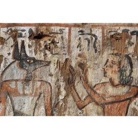 Elemento in legno di cofanetto per ushabti realizzato in legno stuccato e policromato. La scena rappresenta il defunto con perizoma a gonna e grande pettorale intento a recitare la preghiera di consacrazione delle offerte al dio Anubi che lo fronteggia. Al centro, sopra l'altare, resta la traccia di un fiore di loto. La parte superiore della scena riporta una doppia iscrizione geroglifica su quattro colonne, decifrabile solo parzialmente, che recita: "Parole dette...".