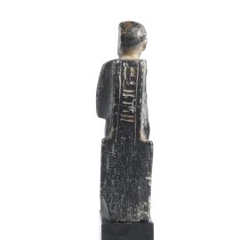 Scultura a tutto tondo realizzata in scisto. Rappresenta il dio Ptah in posizione assisa su trono. I piedi sono rialzati da un sostegno realizzato tutt'uno con il trono. La superficie posteriore dello schienale del trono sul quale poggia la divinità reca ancora delle scritte in geroglifico.