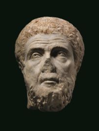 Testa ritratto in marmo bianco a grandi cristalli raffigurante un uomo barbato con corti capelli mossi, arcate sopraorbitarie accentuate, grandi occhi aperti con pupille rese a trapano, naso diritto e piccola bocca. L'indicazione delle rughe sulla fronte ed il tenue modellato del volto, in particolare sugli zigomi, tradiscono l'età matura del soggetto, il cui prestigio sociale è però denotato dalla ricca barba, dall'accurata capigliatura (con sottili ciocche metalliche studiatamente mosse sul capo) e dallo sguardo drammaticamente rivolto verso l'alto.