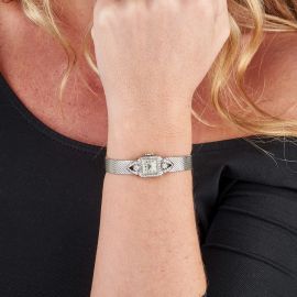 cassa quadrata in platino, quadrante bianco firmato "Baume & Mercier", indici applicati, ghiera impreziosita da diamanti, movimento a carica manuale, fondello e bracciale in oro bianco 18kt di produzione italiana, lungh. cm 16, gr. 29.