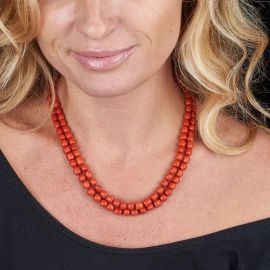 realizzata a doppio filo di barilotti in corallo di mm 7-6 circa, fermatura in argento, lungh. cm 47, gr. 62