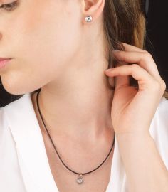 composta da collana in tessuto, metallo e oro bianco 18kt, accompagnata da un paio di orecchini in oro bianco 18kt, impreziosita da tre diamanti taglio brillante per ct 1 circa, lungh. collana cm 45, dim. orecchini cm 0,5x1 circa, chiusura a farfallina, punzone 750, gr. 6 complessivi