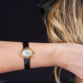 cassa in argento vermeil, punzone 925, fondello serrato con viti, corona con pietra cabochon blu, lunetta decorata a tre anelli intrecciati, quadrante argenté, grafica nera, numeri romani, movimento al quarzo, cinturino in pelle nera lucida con fibbia in metallo dorato originali, vetro minerale. Diam. mm 27