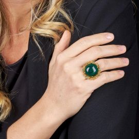 in oro giallo 18kt, al centro una malachite circondata da piccole semisfere in pasta di turchese, mis. 10/50, gr. 16