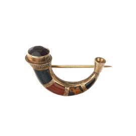 in oro a basso titolo, di cui una a barretta con pendente di dim. cm 4,5x4 circa, accompagnata da una seconda spilla a forma di corno con pietre dure di dim. cm 3x2 circa, gr. 12 complessivi