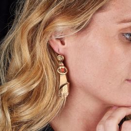 in oro a bassissimo titolo, una spilla con ciondoli impreziositi da paste vitree di dim. cm 3,5x4 circa, accompagnata da un paio di orecchini pendenti, dim. cm 2x7 circa, lungh. cm 6,5 circa, gr. 14 complessivi