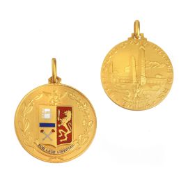 composto da tre medagliette in oro giallo 18kt di dim. cm 3,5x4,5, accompagnati da una sterlina, gr. 60 circa complessivi