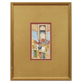 acquerelli su carta entro cornici, rappresentanti uno scontro tra due cavalieri lungo un fiume e una scena con personaggi all'esterno di un edificio.
