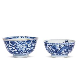 清 十七至十八世纪 青花卷草龙纹瓷器一组四件 龙纹碗玉珍款 酱口缠枝莲纹碗 画押款 高6,3-9,5厘米 最大口径15厘米