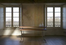 Scrivania con piano in noce canaletto e struttura in acciaio cromato