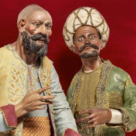 testa in terracotta policroma, mani e piedi in legno dipinto, occhi in vetro, manichino in fil di ferro ricoperto di stoppa, abbigliato con giacca verde e gilet giallo operati in oro, pantaloni rossi cinti da fusciacca verde e oro, da cui pende una scimitarra, sulla testa porta turbante color crema impreziosito da decori in oro, alt. cm 42 (esclusa base)