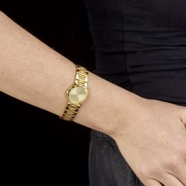 cassa di forma in acciaio, fondello serrato con viti, lunetta in acciaio con viti, corona con pietra faccettata di colore blu, quadrante bianco firmato Cartier, grafica nera, numeri romani a smalto, movimento al quarzo, bracciale a maglie in acciaio con viti, lungh. interna cm 20 circa, chiusura doppia deployant in acciaio marcata Cartier, vetro minerale. Dim. mm 23x35