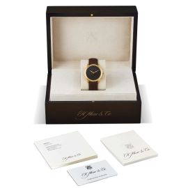 cassa in oro giallo 18kt, fondello serrato con viti con movimento a vista, anse sagomate, corona marcata, quadrante guillochè nero, movimento a carica automatica, cinturino in pelle marrone con fibbia in oro giallo 18kt marcata H. Moser & Cie, vetro minerale, gr. 90. Diam. mm 39. Corredato di scatola e garanzia. Condizioni pari al nuovo.