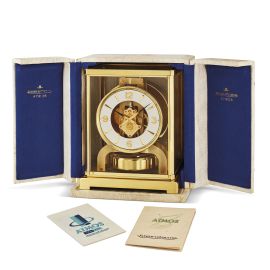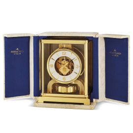 struttura in ottone con vetri laterali, quadrante bianco con movimento parzialmente a vista firmato Jaeger LeCoultre Atmos, numeri arabi e indici applicati, movimento perpetuo a pressione atmosferica. Dim. cm 18x22x13,5. Corredato di scatola e libretto di istruzioni. Orologio non funzionante.