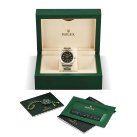 cassa in acciaio, fondello serrato a vite, lunetta liscia in acciaio, corona marcata, quadrante nero con indici applicati al superluminova, grafica bianca, scritta Milgauss in arancio e lancetta dei secondi a saetta, movimento a carica automatica, bracciale oyster a maglie piene satinate e lucide, lungh. interna cm 20, cod. produzione 5CC, chiusura a scatoletta marcata Rolex, vetro minerale verde. Diam mm 40. Corredato di scatola, controscatola, garanzia, libretto e una maglia aggiuntiva.