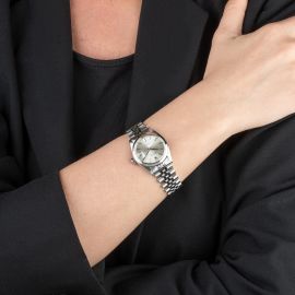 cassa in acciaio, fondello serrato a vite, corona marcata, lunetta liscia in acciaio, quadrante argentè, grafica nera, indici applicati con trizio, datario a ore tre con lente cyclope, movimento a carica manuale cal 1225, bracciale jubilee in acciaio, ref. 62510M finali 587, lungh. interna cm 18, chiusura a scatoletta marcata Rolex, vetro minerale. Diam. mm 30