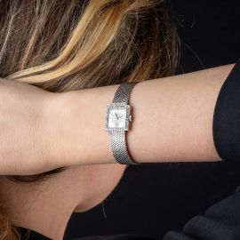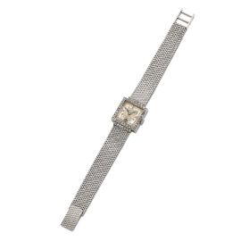 cassa di forma in oro bianco 18kt, fondello a pressione, lunetta e anse impreziosite da una fila di diamanti, quadrante argenté (difetti), numeri arabi stampati, secondi a ore sei, movimento a carica manuale, bracciale integrato a maglia tessita in oro bianco 18kt con chiusura a scomparsa, lungh. cm 18, gr. 33. Dim. mm 18x18