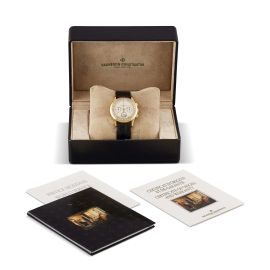 cassa in oro giallo 18kt, fondello serrato con viti, corona marcata, tasti del crono rettangolari, quadrante color avorio, grafica nera, indici applicati, tre contatori, secondi e datario a ore sei, movimento a carica automatica cal 1136 n. 804499, cinturino non originale in pelle nera, fibbia in oro giallo 18kt marcata Vacheron Constatin, vetro minerale, gr. 63. Diam. mm 35. Corredato di astuccio e garanzia.