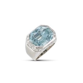 in oro bianco 18kt, composta da un anello a fascia impreziosito al centro da un'acquamarina taglio ottagonale di ct 14 circa, circondata da diamanti taglio brillante e huit huit per ct 1.70 circa, mis. 12/52; accompagnato da un paio di orecchini con due acquamarine taglio ottagonale per ct 4.80 circa, sormontate da due diamanti taglio brillante, chiusura a farfallina, punzoni 750 e del fabbricante "3729 AL", dim. cm 1x1,5 circa, gr. 20 complessivi. Corredata di certificato IGN del 13/03/2024 attestante le caratteristiche dell'anello.