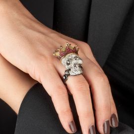 in oro giallo, bianco 18kt e oro brunito 14kt, realizzato a forma di teschio incoronato, impreziosito da pavé di diamanti taglio brillante per ct 2 circa, firmato "B.D.", punzoni 750 e del fabbricante "1462", mis. 9/49, gr. 31