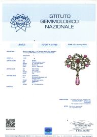 in oro e argento, impreziosita da rubini birmani taglio ovale e cuscino per ct 1.90 circa, un topazio rosa taglio a goccia di ct 3.10 circa, diamanti taglio vecchio, antico e a rosa per ct 4 circa, dim. cm 4,5x5, gr. 14. Corredata di certificato IGN del 10/10/2024 attestante le caratteristiche e l'assenza di trattamenti termici sui rubini e sul topazio.