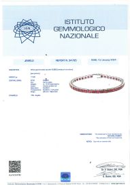 in oro bianco 18kt, impreziosito da una fila di rubini birmani taglio carré per ct 12.50 circa, punzone 750, lungh, cm 18,5, gr. 17. Corredato di certificato IGN del 10/01/2024 attestate l'origine geografica della pietra e l'assenza di trattamenti termici.
