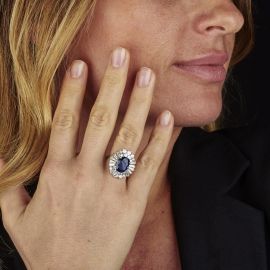 in oro bianco 18kt, al centro uno zaffiro taglio ovale di ct 3.95, circondato da diamanti taglio brillante e tapes per ct 2.50 circa, punzone 750, mis. 12/52, gr. 7. Corredato di certificato IGN del 26/02/2024 attestante l'origine geografica della pietra e l'assenza di trattamenti termici.
