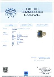 in oro giallo 18kt, impreziosito al centro da uno zaffiro ceylon taglio cabochon di ct 8.70 circa, circondato da diamanti taglio brillante (uno mancante) per ct 1.60 circa, punzone 750, mis. 10/50, gr. 8. Corredato di certificato IGN del 19/01/2024 attestante l'origine geografica della pietra e l'assenza di trattamenti termici.