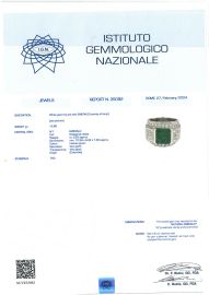 in oro bianco 18kt, al centro uno smeraldo colombiano taglio ottagonale di ct 5.20 circa, circondato da diamanti taglio brillante per ct 2.60 circa, punzone 750, mis. 14/54, gr. 15. Corredato di certificato IGN del 27/02/2024 attestante le caratteristiche e l'origine della pietra.