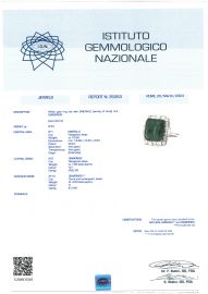 in oro bianco 18kt, impreziosito al centro uno smeraldo taglio ottagonale di ct 10.66, affiancato da due diamanti taglio ottagonale per ct 1.80 circa e circondato da diamanti taglio carré per ct 3.50 circa, mis. 13/53, gr. 8. Corredato di certificato IGN del 20/03/2024 attestate le caratteristiche e l'origine geografica della pietra.
