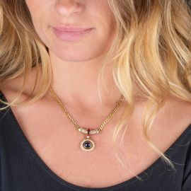in oro giallo 18kt, realizzata a maglia groumette, con pendente impreziosito da uno zaffiro taglio cabochon di ct 3 circa, rubini taglio baguette per ct 0.40 circa e diamanti taglio brillante per ct 1 circa, punzoni 750 e del fabbricante "136 BO", lungh. cm 42, gr. 29