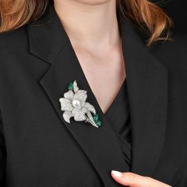 in platino, impreziosita da foglie in smeraldo inciso e al centro da una perla naturale a forma di goccia di mm 12x17 circa circondata da pavé di diamanti taglio brillante e baguette per ct 15 circa, dim. cm 6x7, gr. 43. Corredata di certificato IGN del 9/04/2024 attestante le carateristiche della perla.