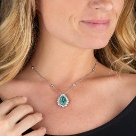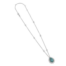 in oro bianco 18kt, impreziosita da diamanti taglio brillante per ct 0.90 circa, da cui pende un ciondolo a forma di goccia di cm 2x2,5, con al centro una tormalina Paraiba di ct 2.43, circondata da una fila di tormaline taglio rotondo per ct 0.40 circa e una di diamanti taglio brillante per ct 3 circa, punzone 750, lungh. cm 51,5, gr. 14. Corredata di certificato IGI Anversa del 16/11/2020 attestante le caratteristiche della tormalina.